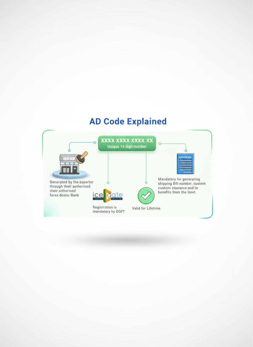 An AD Code is a unique number issued by authorized banks to exporters and importers for facilitating foreign exchange transactions and customs clearance.