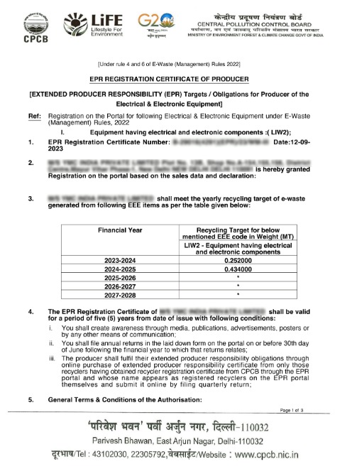 The E-Waste (Management) Rules, 2022 say that companies that sell electronic goods must have EPR Registration from the Central Pollution Control Board (CPCB), keep their certificates up to current, and meet their annual recycling goals.