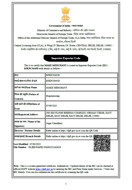 Make Merchant can assist in obtaining the IEC certificate by guiding you through the entire application process, helping with the preparation and submission of required documents, ensuring compliance with government regulations, and managing the timely submission and follow-up of the application on the DGFT portal. This simplifies the process, reducing delays and errors, and enables you to receive your IEC certificate smoothly and quickly, empowering your import-export business.