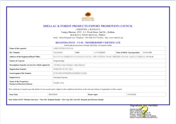 The Shefexil Certificate, also known as the Registration Cum Membership Certificate (RCMC), is given out by the Shellac and Forest Products Export Promotion Council (SHEFEXIL). The Government of India's Ministry of Commerce and Industry set up SHEFEXIL as a separate organization to help and promote the export of shellac, lac, gums, resins, and other forest products. This certificate shows that you are registered and that you are an exporter in this industry. It's also important to follow the law when you export these commodities from India. It also helps exporters find the many government-provided export incentives, subsidies, and promotional bonuses. The Directorate General of Foreign Trade (DGFT) and the Ministry of Commerce warn that exporters must keep their SHEFEXIL membership up to date in order to send shellac and forest products.